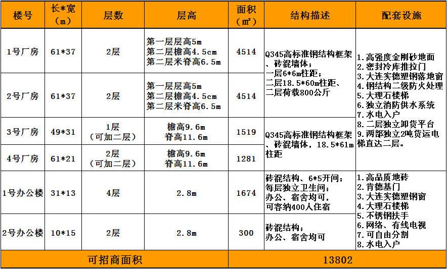 承重:1、2号厂房为两层结构,二层承重800kg/平米,3、4号厂房为单层结构。