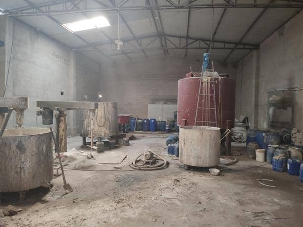 总占地5.5亩,厂库房1800平米,高6米。办公400平米、住宿200平米