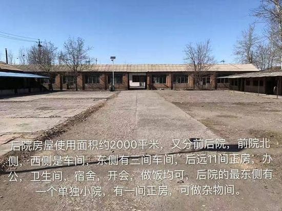 后院3300平米,房屋使用面积约2000平米,又分前后院,前院北侧,西侧是车间,东侧有三间车间,后远11间正房,办公,卫生间,宿舍,开会,做饭均可,后院的东侧有一个单独小院,有一间正房,可做杂物间。