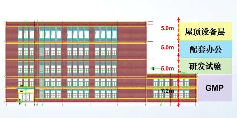 1.首层层高7.2米, 标准层层高5米,柱距8米;