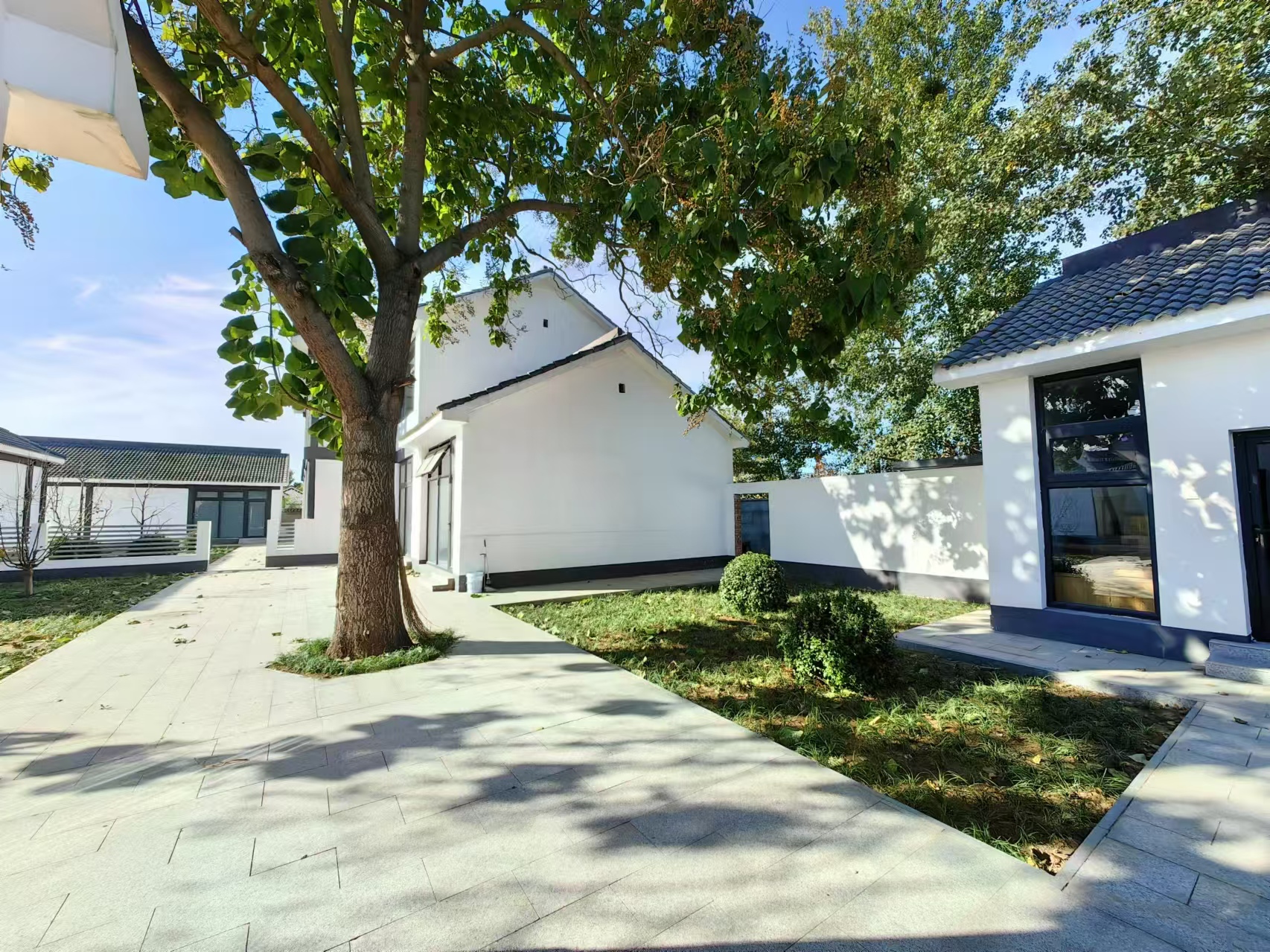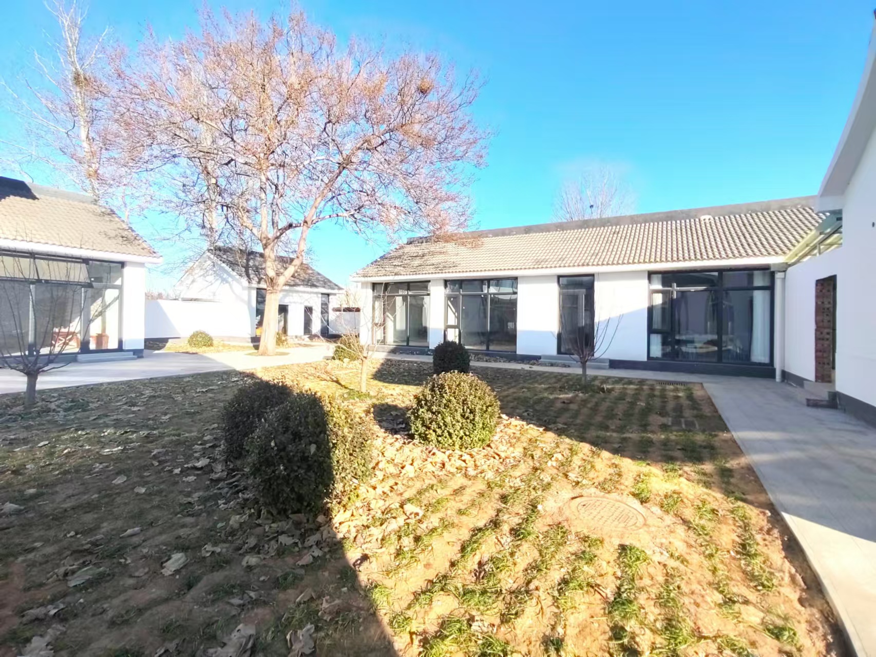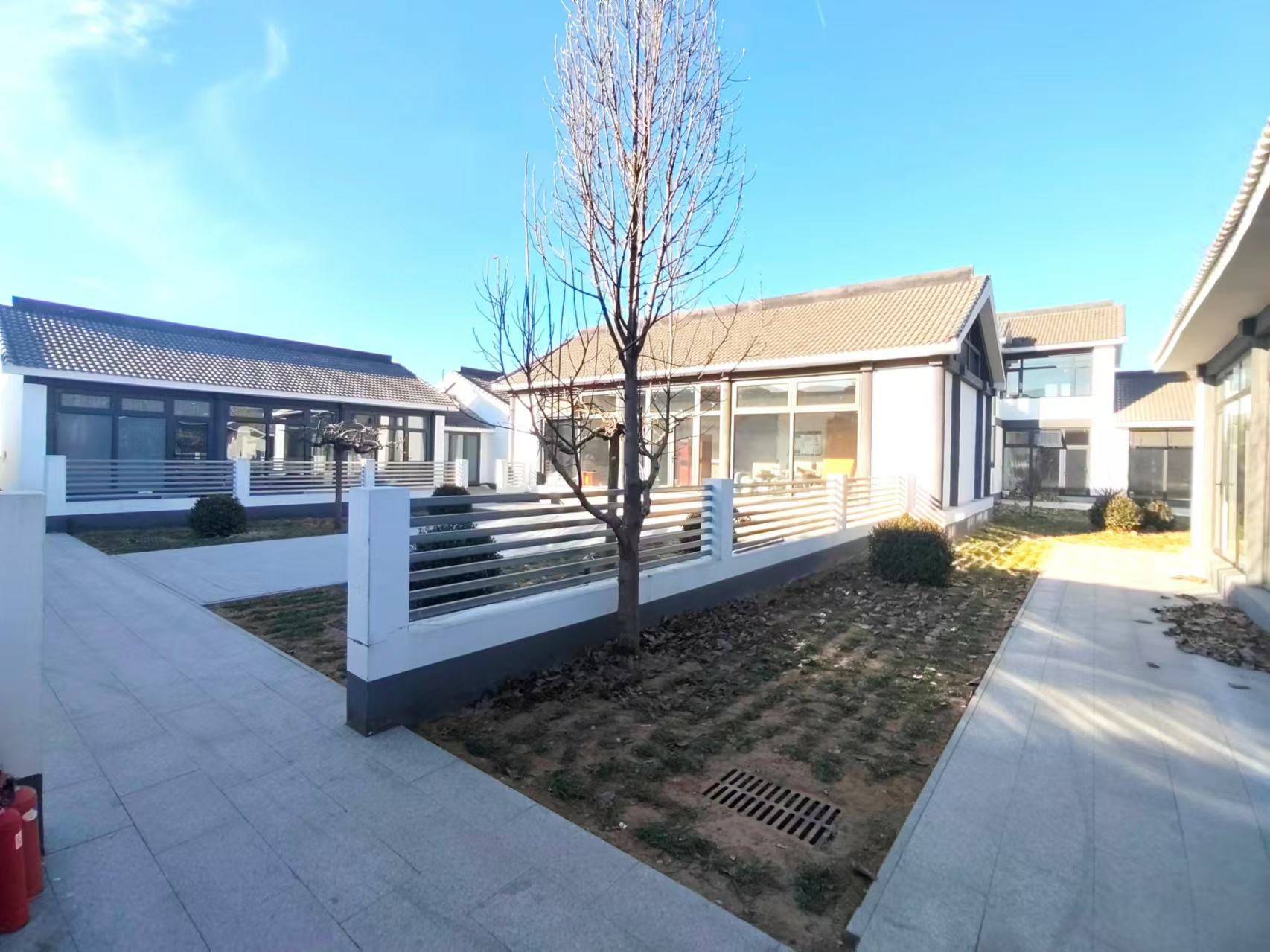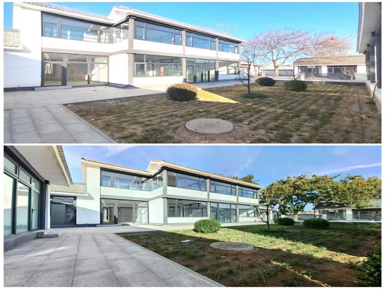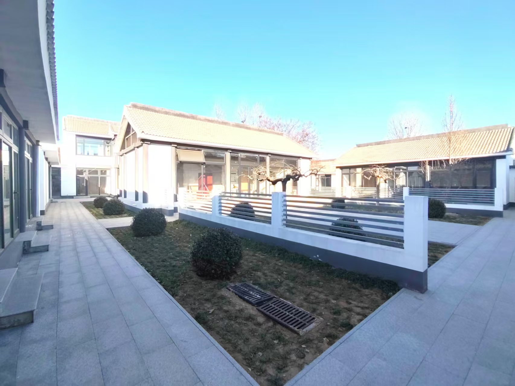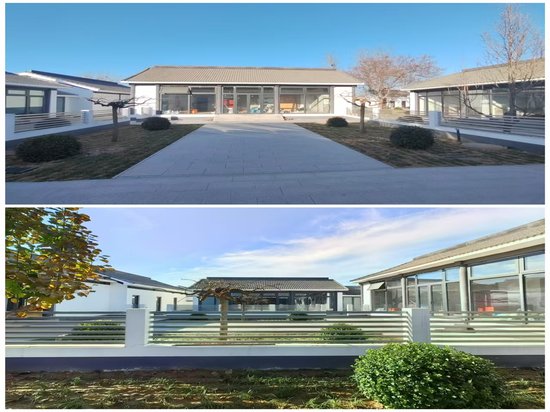 二、总体建筑风格融合徽派和北京大四合院风格,更加适合大型办公场所需求,兼具休闲接待等社交需求,主楼采取二层建筑,院内通过篱笆墙进行了区域分割,具有较好的私密性。